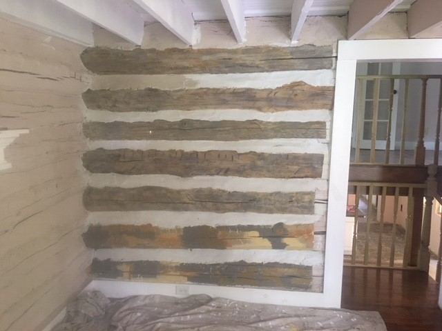 I Kilz back the Pepto Bismol and assemble my remedial logs-in-a-can repair kit, each with their own chip brush in assorted sizes. Craning my head back and forth around the door jamb to study my virgin, unviolated logs, I start with the predominant colors. Keeping the brush pretty dry, I skip around the length of the log, adding color in long intermittent swaths. After spending several hours on just a few logs, I decide to try and speed up the process, using the same colors here and there on multiple logs. (I don’t have the heart to count, but Aunt Bob’s handiwork saturated the entire room). Wow! I end up with camouflage!